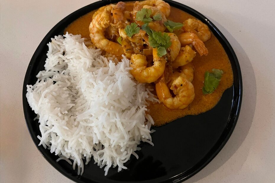 This shrimp curry comes together while your rice is cooking, but if you’re really pressed for time, you can make the curry sauce ahead of time and add the shrimp at the last minute. Serves 4:
