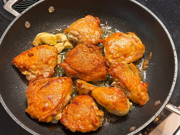 Add the garlic to the pan. Flip the chicken and cook until the bottom is lightly browned and the meat is cooked through, about 5 minutes. Transfer the chicken to a plate, skin side up. Remove all but 3 tablespoons of the fat from the pan.